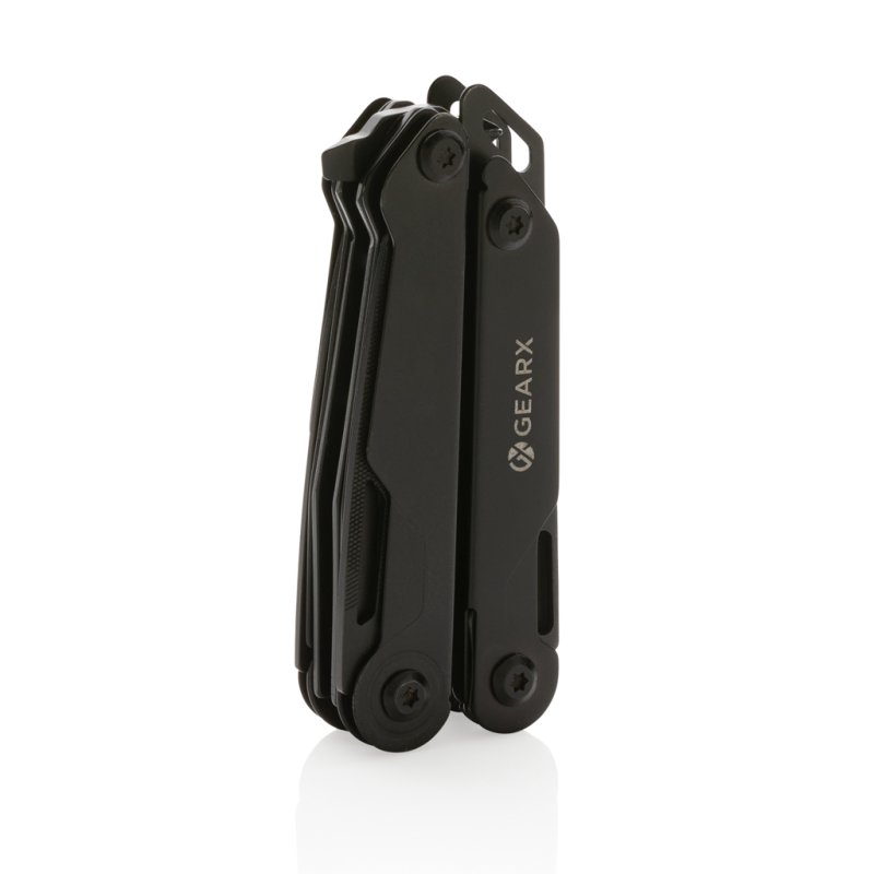 Luxusní multifunkční nástroj pro široké využití uvnitř i venku. Všestrannost, pevnost a odolnost jej charakterizují nejlépe. Tělo vyrobené z luxusního hliníku, nástroje a čepel z prémiové 420 nerezavějící oceli. Vše v černém odstínu. Disponuje celkem 13 funkcemi: nůž (se zámkem), pilka, pilník, velký plochý šroubovák (se zámkem), standardní plochý šroubovák, křížový šroubovák, kleště, standardní kleště, štípačky, otvírák lahví, šroubovák, nůž na pás, nůž na balíky. Baleno v luxusní dárkové krabičce.