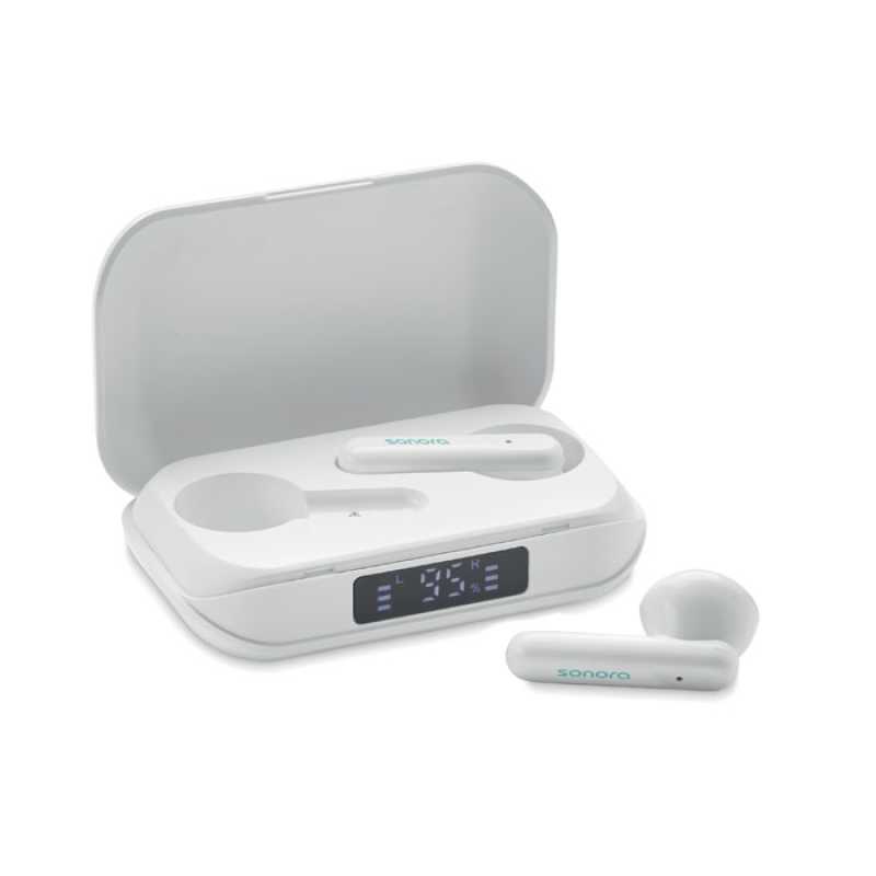 Bezdrátová stereofonní TWS sluchátka z recyklovaného ABS s mikrofonem a vestavěnou baterií 25 mAh. Doba hraní cca. 3 hodiny. LCD displej s ukazatelem úrovně nabití. Automatické párování. Včetně nabíjecího kabelu typu C a nabíjecí stanice s kapacitou 250 m