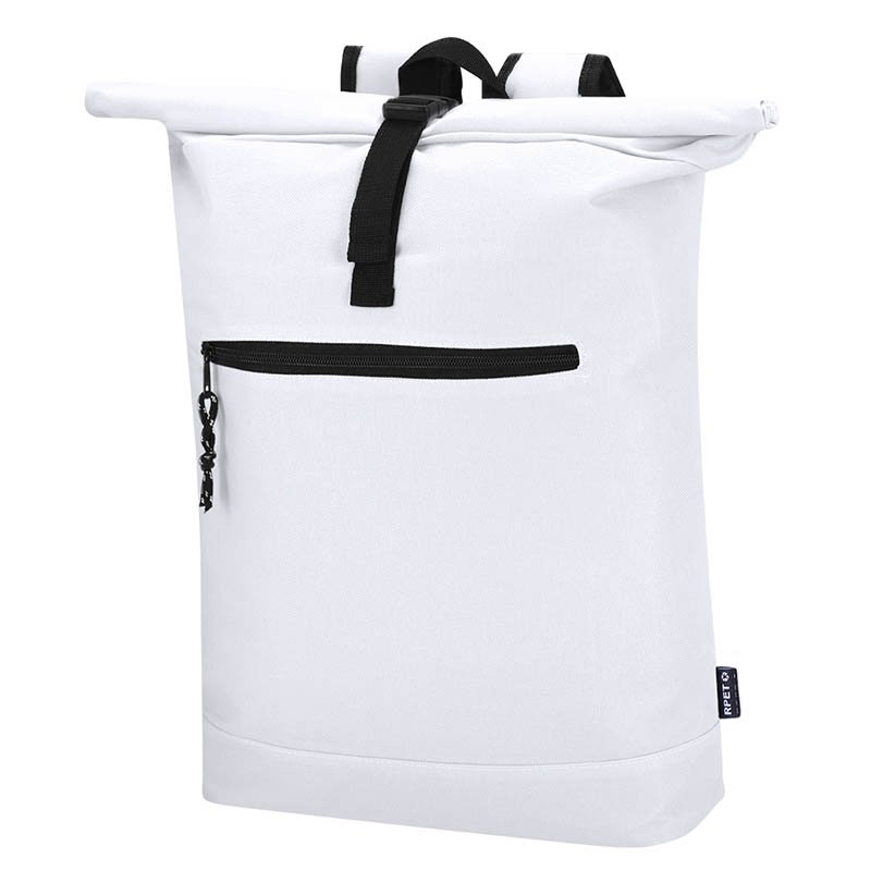 NOVINKA 2025. Backpack made of durable RPET 600D polyester. Features a main pocket that closes with a buckle, with padded compartment for laptop up to 15 inches, and an additional front pocket with zipper closure. The shoulder straps are padded and adjustable. RPET logo on the tag and black accessories.RPET material is made from recycled plastic to promote the reuse of plastic waste and help the sustainability of the planet.
