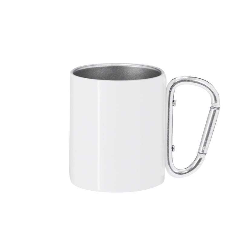 NOVINKA 2025. 220ml stainless steel mug, with a body of shiny white metallic finish and a functional carabiner-shaped handle for easy transport. Specially designed for sublimation.