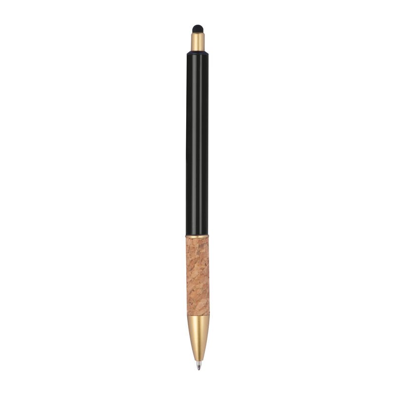 Ekologické plastové kuličkové pero z pšeničné slámy s pouzdrem potaženým přírodním korkem. Se 4 barevnými náplněmi: černá, modrá, zelená a červená.