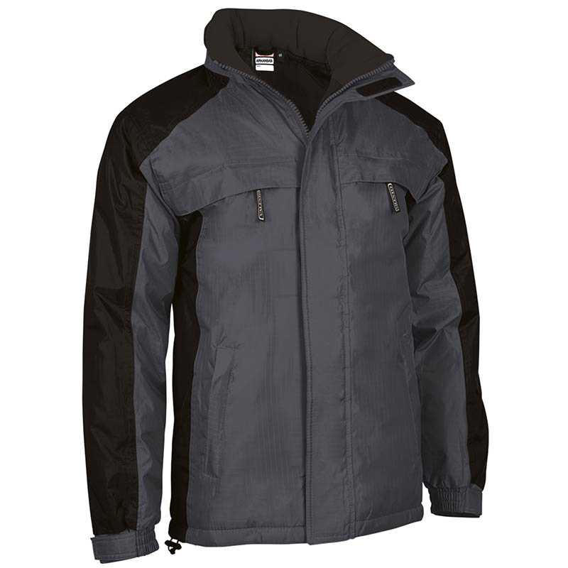 Two-Tone Waterproof Hooded Parka. Made of long-lasting Ripstop outer waterproof fabric with smooth inner lining, inner quilting and anti-pilling fleece lining on neck and pockets for ensuring excellent thermal insulation. Thermo-sealed seams that prevent water leaks and hidden hood that can be easily opened and closed by velcro closure and also can be used as a raincoat. Straight-cut waist with elastic drawstring and stopper, adjustable cuffs with velcro fastening for a better fit and added comfort. Two slanted waist pockets, two chest pockets and an inner left chest pocket, all zippered, for a secure and convenient storage. Includes an inside back zip for easy marking with different methods: screen printing, embroidery, transfer printing, shields, vinyl application. Ideal as promotional clothing, workwear and outdoor activities.