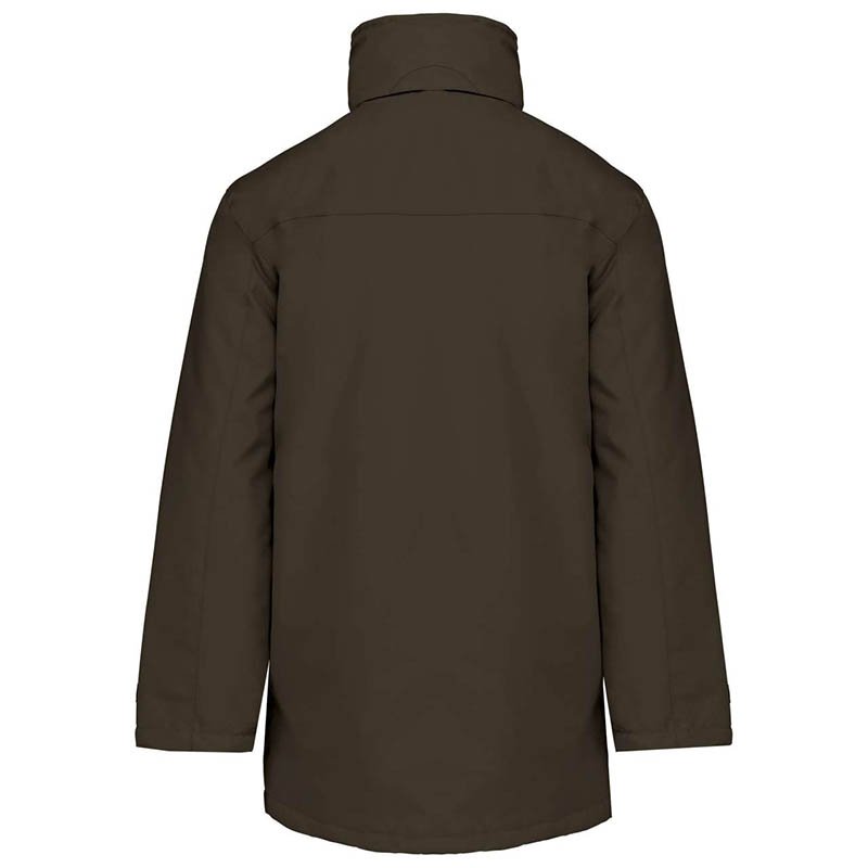 Waterproof Parka with Pockets.Made of outer waterproof flat weave, smooth inner lining and inner quilting for ensuring excellent thermal insulation. Stand-up collar with full-zip velcro flap front closure, for warmth and comfort. Hidden hood that can be easily opened and closed by velcro closure and also can be used as a raincoat. Two slanted zippered waist pockets and an inner left chest velcro pocket for a secure and convenient storage.Includes an inside back zip for easy marking with different methods: screen printing, embroidery, transfer printing, shields, vinyl application. Ideal as promotional clothing, workwear and outdoor activities.