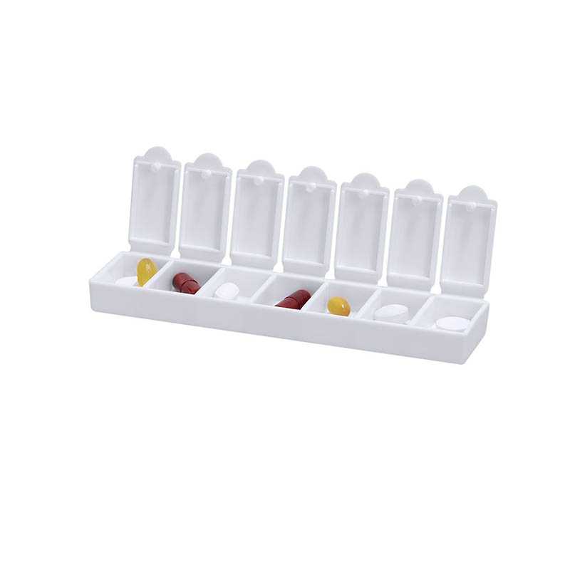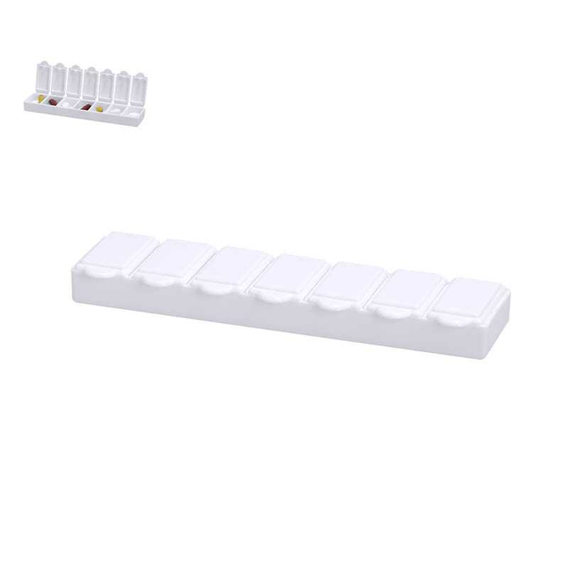 NOVINKA 2025. Weekly pill organizer made of durable solid white PP material. Includes 7 individual compartments with safety closures. BPA free.