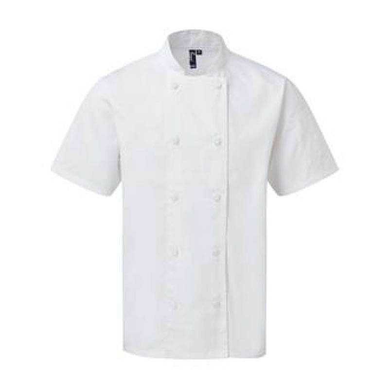 Short Sleeve Chef´s Jacket.Made of a lightweight cotton-polyester blend poplin fabric for strength and durability. Open crewneck for added comfort. Double-buttoned front closure for added style, and waist side slits for enhanced mobility. A left chest patch pocket to showcase the branding and two pen holders on the left sleeve for convenient storage. Suitable marking methods: screen printing, embroidery, transfer printing, vinyl application.Ideal as workwear and hospitality clothing.