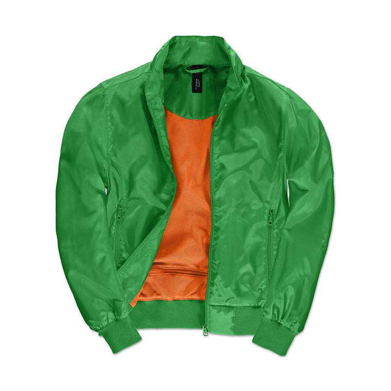 TRENDY LIGHTWEIGHT BOMBER JACKET ·Ergonomic concealed hood ·Diamond mesh lining ·Trendy lightweight bomber jacket with ergonomic concealed hood ·Fashionable contrasted mesh lining improves breathability and comfort ·Contemporary cotton feel heavy rib on cuffs and bottom hem ·Forward shoulder seams for better comfort and water protection · Zip at lower back for easy full decoration access (front - back - sleeves) ·Fabric tested for all print techniques and embroidery ·2 zipped hand pockets. Značka:B&C. Materiál:100% polyester 210T taffeta