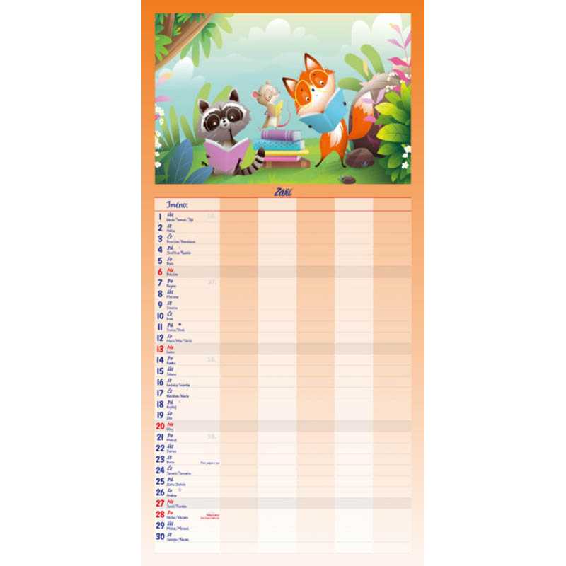 Velký formát kalendáře pro celou rodinu. České kalendárium a samostatný plánovač aktivit až pro šest členů domácnosti doplňují veselé grafické motivy pro každé roční období. Díky dostatečnému prostoru pro poznámky vám neuteče žádná důležitá událost. Ploch