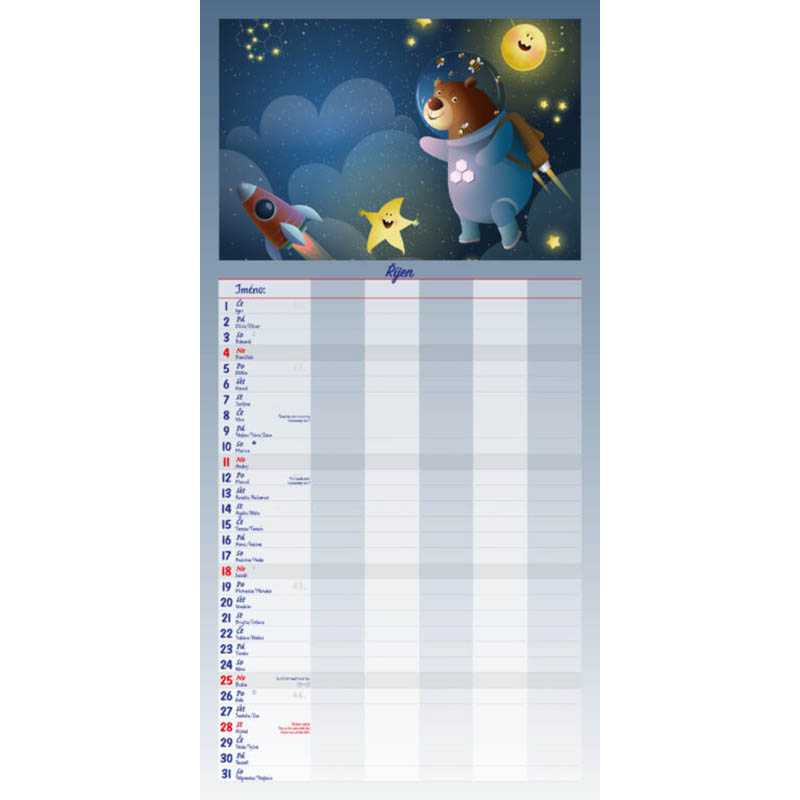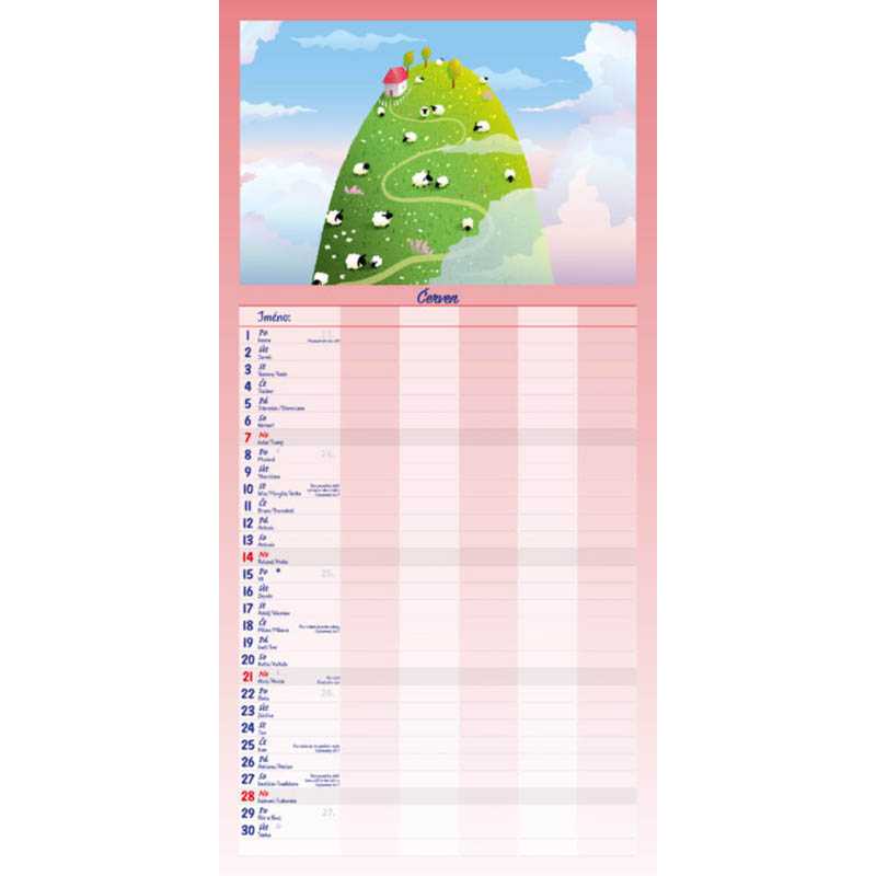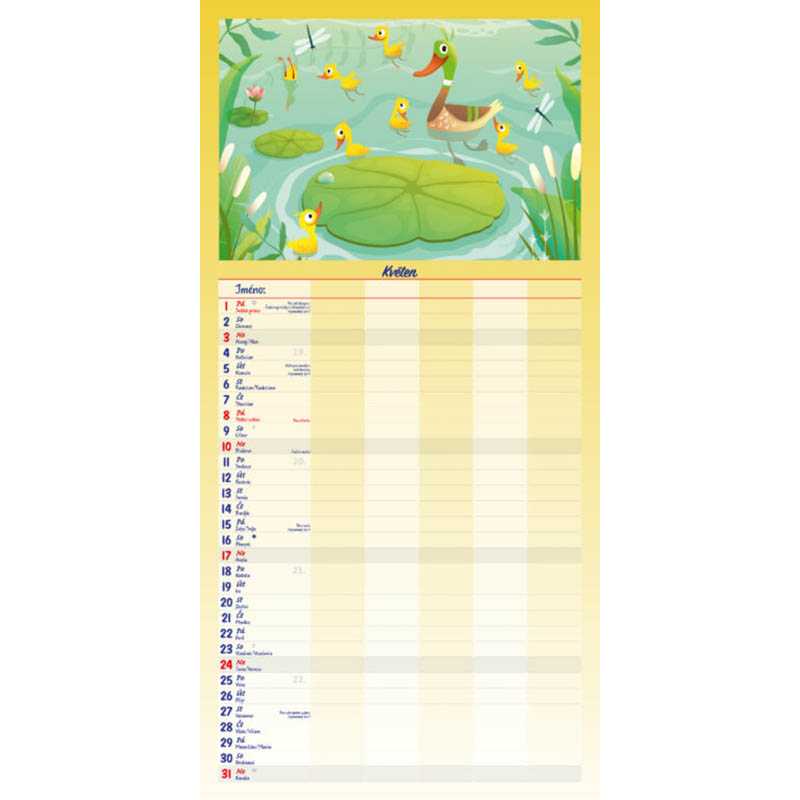 Formát kalendáře: 31,5 x 63 cm . Kalendárium: české měsíční jmenné . Rozsah kalendáře: 14 listů . Vazba: Twin-wire (se spirálou) . + políčko pro každého z rodiny