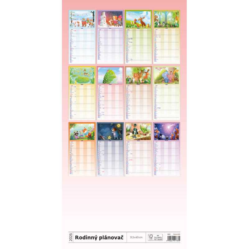 Rodinný plánovač. Formát kalendáře: 31,5 x 45 cm. Kalendárium: české/ slovenské měsíční jmenné. Rozsah kalendáře: 14 listů. Vazba: Twin-wire (se spirálou). + políčko pro každého z rodiny