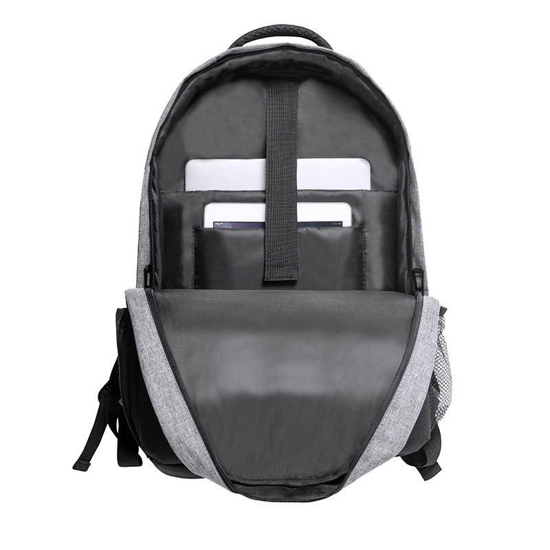 NOVINKA 2025. Multifunctional backpack made of 300D RPET. Made from recycled and water resistant polyester, with excellent breathability in the back area, facilitating heat dissipation thanks to its padded straps and padded back. The wide shoulder straps are designed to relieve pressure on the shoulders, enabling the backpack to be worn comfortably for long periods of time.Perfect for any situation, and with multiple compartments: 2 front pockets. 3 large central compartments, one of which is a large compartment, a large central pocket for storing clothes and/or accessories with an organiser inside, and a third padded pocket, perfect for carrying a laptop up to 17.3 inches. It also has 3 special compartments, a side pocket perfect for quick access, a shoe pocket on the bottom with ventilation eyelets, and an anti-theft pocket on the back, plus USB cable. Perfect for travel or everyday use with adjustable straps to suit all lifestyles. Available in black and grey, with RPET label included. Presented individually in a recycled bag.