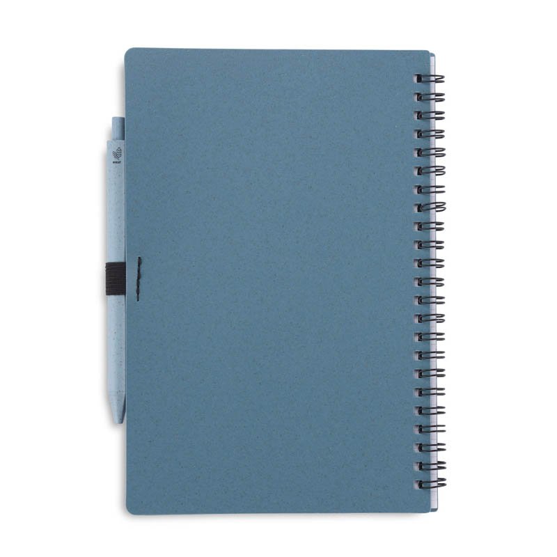 Zápisník TRESA s perem, barevně ladí s přebalem. Propiska a obal sešitu jsou vyrobeny z pšeničné slámy. Spirálový zápisník se 70 čtverečkovými listy z recyklovaného papíru. Formát A5. Modrá náplň do pera.