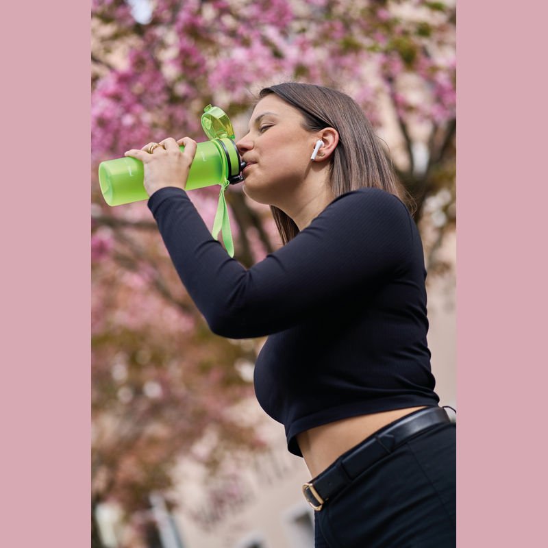 Láhev na vodu vyrobená z tritanového plastu bez obsahu BPA. Poutko na víku umožňuje snadné zavěšení na cvičební stroj a láhev je díky svému ideálnímu tvaru vhodná pro většinu držáků na nápoje. Láhev se snadno čistí. Je možné přidat potisk.
