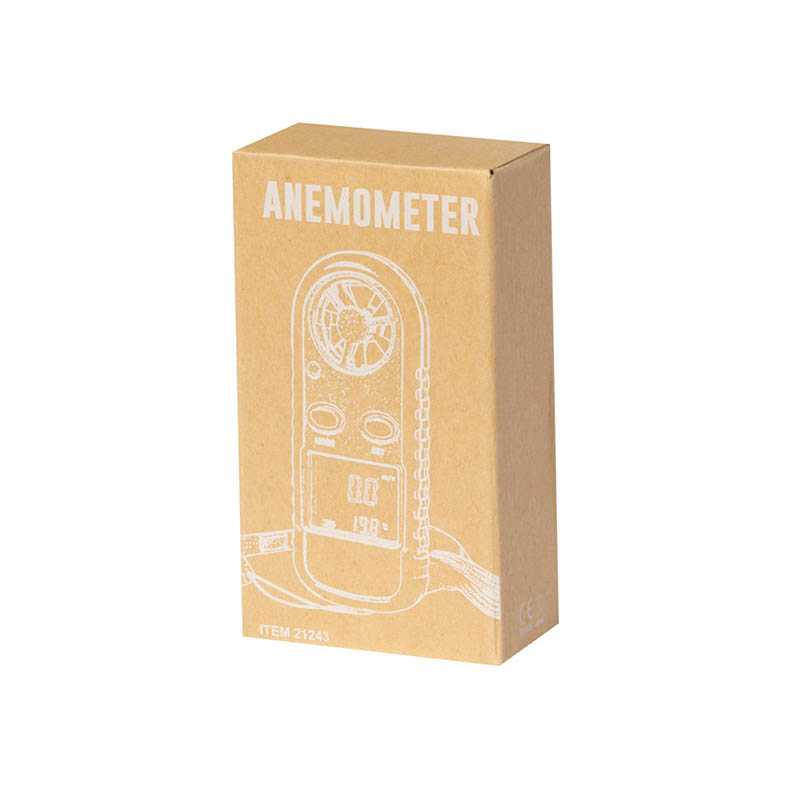 NOVINKA 2025. Anemometer made of durable ABS. With large backlit LCD display showing wind speed, temperature and battery level. Incorporates measurement functions for current, maximum, and average air speed. A multitude of measurement units are available, including Beaufort intensity scale and air speed in different formats (m/s; km/h; ft/min; knots; mph). In addition, it displays ambient temperature in °C/°F, atmospheric temperature and thermal sensation. With automatic shut-off function after a few minutes of inactivity and storage memory that allows access to records saved in previous measurements, even if the device has been switched off previously. Powered by a button cell battery (included) and packaged individually in a kraft finish box.