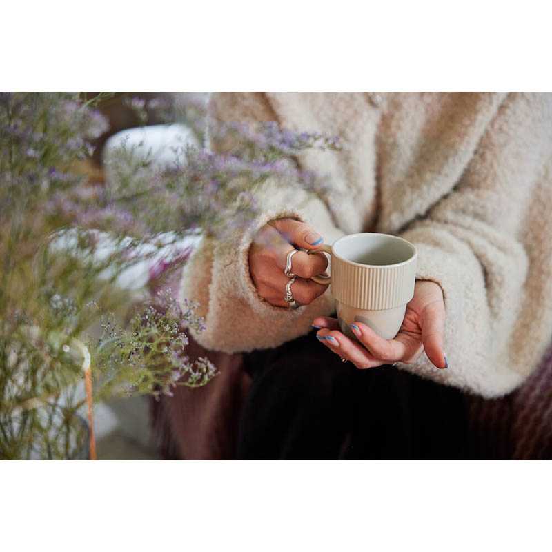 With the Inka mug, we aimed to create a smooth, appropriately sized, and stackable cup available in various natural and soft colors. Perfect for everyday life and the workplace. The mug features a rounded base that gives it a soft silhouette, contrasted by a sturdy rim with Sagaform's characteristic stripe. It also includes a practical, stylish handle. It pairs perfectly with the Inka mug without a handle, both because they stack easily and cater to different preferences. The bottom has drainage channels to prevent water from pooling in the dishwasher. Made of stoneware. Available in basic colors and exciting collection colors. Dishwasher safe. Designed by Studio Sagaform. Material: stoneware Size: o8cmx9cm, 27cl Color: BEIGE, PANTONE WARM GRAY 3C