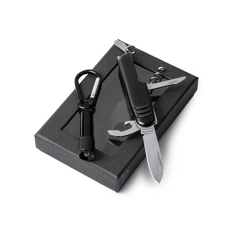 NOVINKA 2025. Set of aluminum knife with 7 functions and carabiner flashlight. In varied colors and presented in an individual box with window and soft foam inside. Button cell batteries included.
