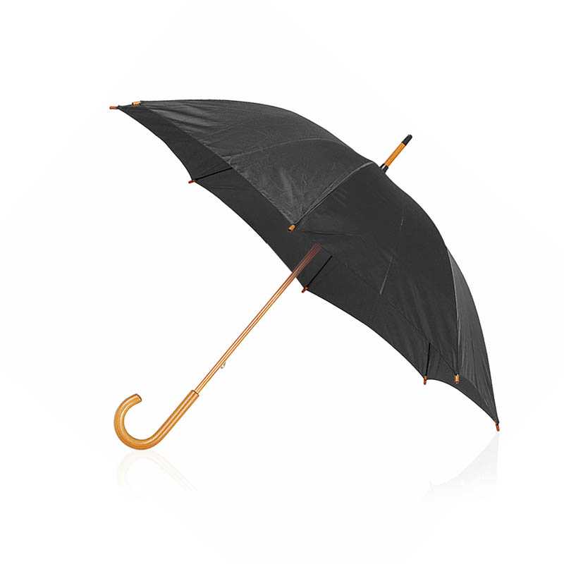 Deštník s automatickým otvíráním, se zahnutou dřevenou rukojetí a s dřevěnou špičkou, v různých barvách. Způsob potisku sítotisk.