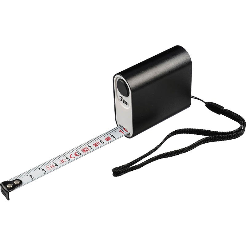 NOVINKA 2025. Aluminum tape measure. 3 meters in length. With push button and printed centimeters, including wrist cord. Individually packaged in a brown cardboard box.