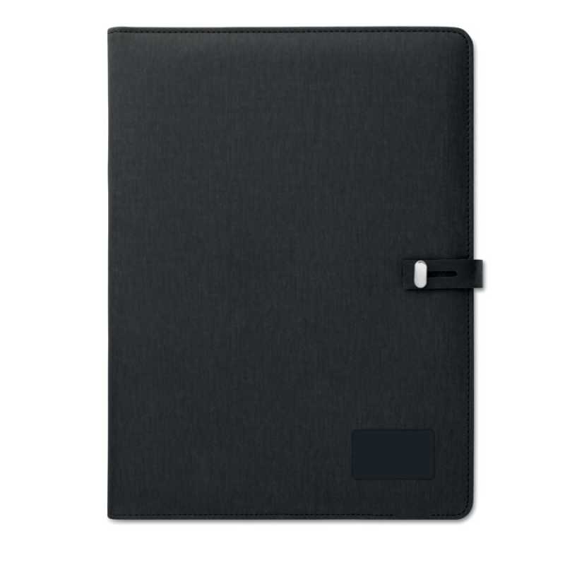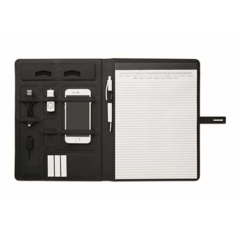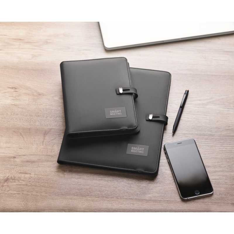 A4 konferenční desky na dokumenty s PU podšívkou. Obsahující DC5V/1A bezdrátovou power banku 4000 mAh. Konektory micro USB a typ C. 40 stránkový linkovaný blok a několik vnitřních kapes. Černý kovový plíšek vhodný pro Vaše logo.
