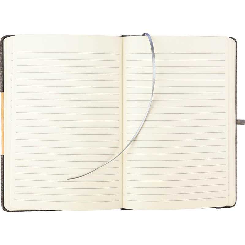 NOVINKA 2025. rPET (300D) notebook (approx. A5) with 80 lined pages (70 gsm). Foldable cover turns into phone holder, featuring bamboo detail on the cover.