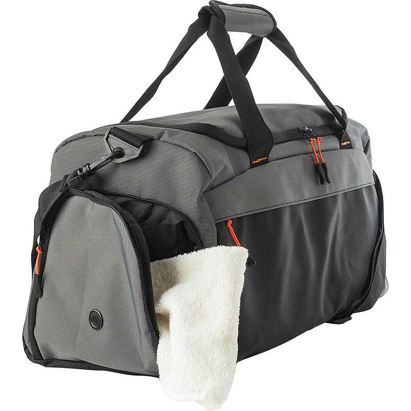 NOVINKA 2025. 500D Two Tone duffle bag with front zippered pocket. Ventilated side shoe compartment, mesh pocket on the opposite side. Short handles with Velcro for closure. Large main compartment with reinforced bottom.