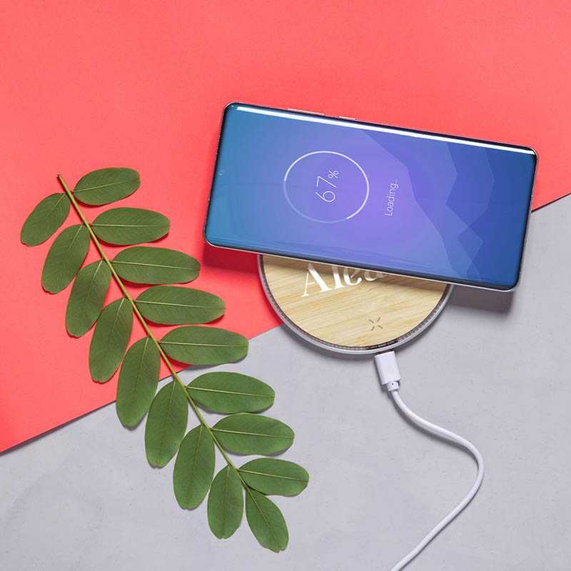 Bamboo wireless charger with RPET details. Fast charging 15W. Individually packaged in a brown cardboard box.
