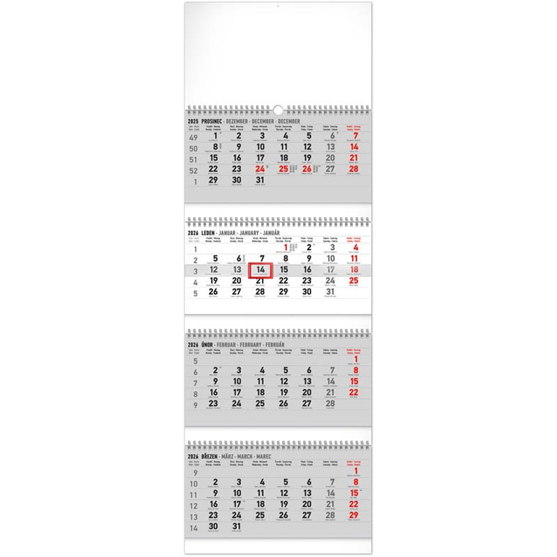 Praktický čtyřměsíční kalendář s plochou pro potisk a náhledem čtyř měsíců současně můžete díky dvojité spirále pohodlně složit do obálky velikosti A4. Kalendárium obsahuje česká jména a světové svátky. Díky volné ploše pro potisk se může stát zcela origi