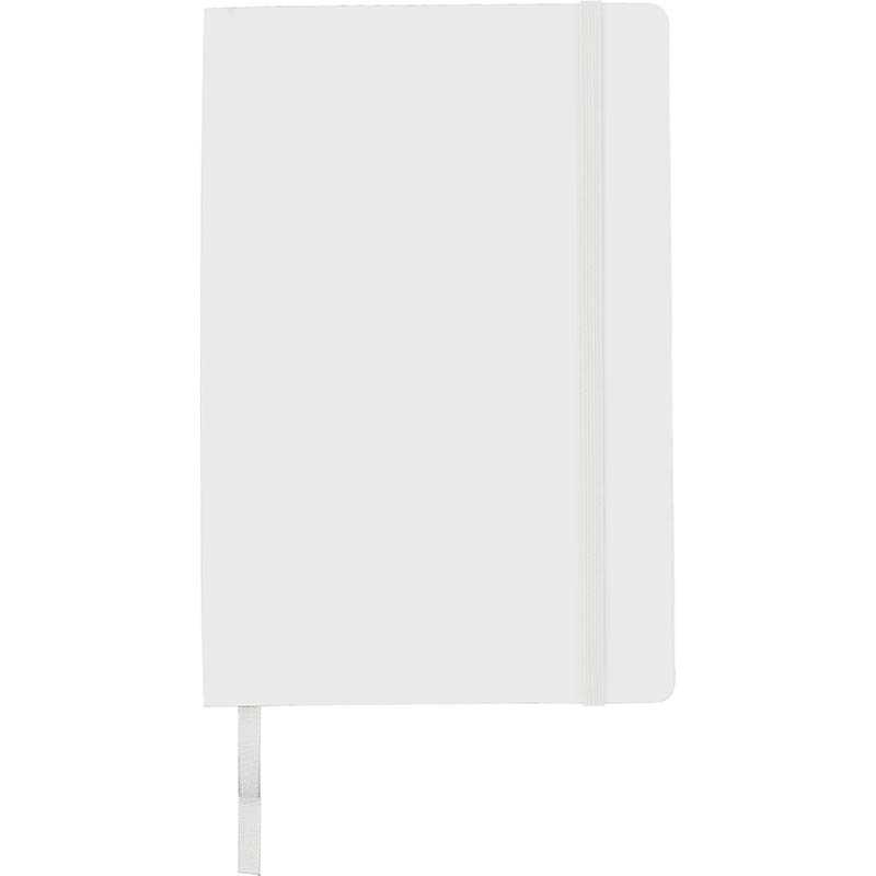 PU soft cover notebook (approx. A5) with 80 lined pages, ribbon marker, elastic band over the cover, and a pocket on the inside of the cover.
