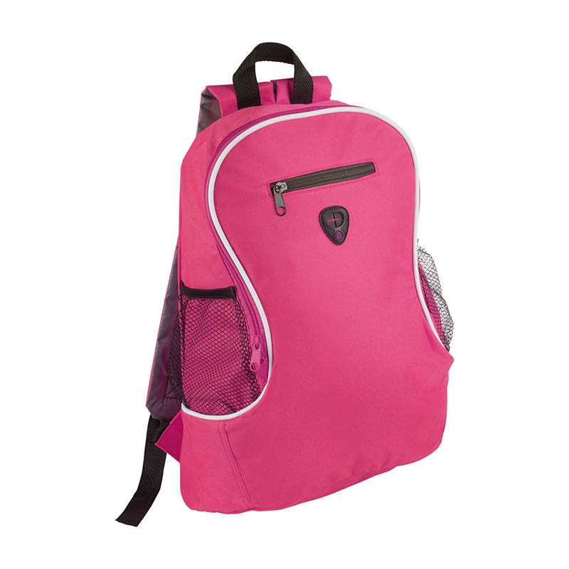600D polyester 3-pocket backpack (one mesh side pocket). Adjustable shoulder straps and padded back