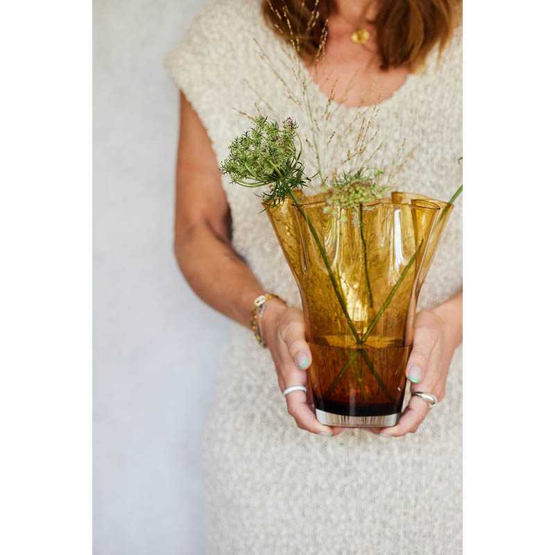 Like a newly emerged flower it unfolds its leaves. Vase Viva flirts with us in a seductive way – the organic shapes and the discreet power. Small vase Viva is perfect for cuttings or a small bouquet. Large vase Viva flourishes like a statuette with and without green leaves and flowers. A Swedish Original which has an obvious place in all homes. Art.no: 5018376 Designer: Studio Sagaform Material: Mouth-blown glass Care: Dishwasher safe Colour: Amber Size: 20x20x24,5cm Packaging: Box