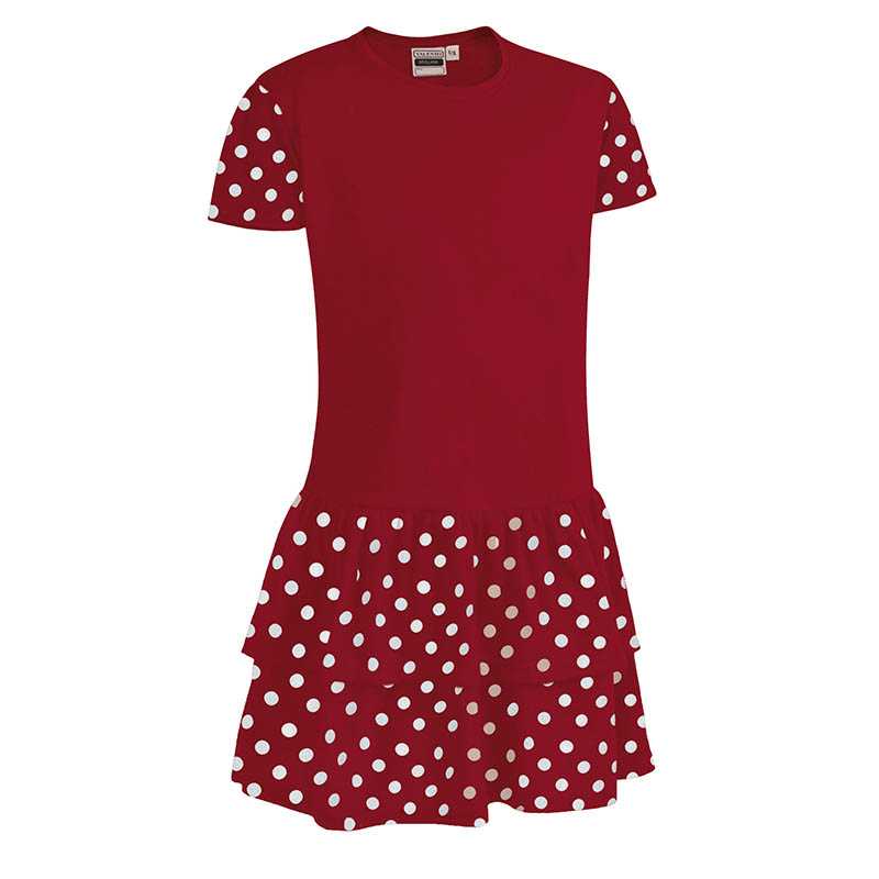 Children´s Crewneck Short Sleeve Printed Dress with Double Ruffle and Funny Design. Made of durable and long-lasting cotton-polyester blend fabric. Contrasting white polka dots print on sleeves and ruffles, adding a touch of originality.Elasticated waistband for a better adjustment and a comfortable fit.Two-tiered and double stitching at the bottom hem for added strength and durability.Suitable marking methods: screen printing, embroidery, transfer printing, vinyl application. Ideal as a summer essential and for a personalised gift.