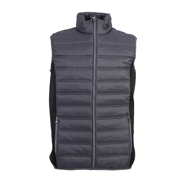 NOVINKA 2025. Composite fabric vest - Front water repellent with soft polyester padding (feather effect) - Back in 3-layer softshell fabric waterproof 3000 mm/H2O, breathability 1000 g/m2/24h - Anti-pilling microfleece lining - Inner fabric under the collar that can be lifted for customization - Laser-cut waterproof zips - Central zip with internal windproof fabric - Chin protection fabric - Two large external pockets with zip - An internal wallet pocket with zip - Stretch fabric in the armholes