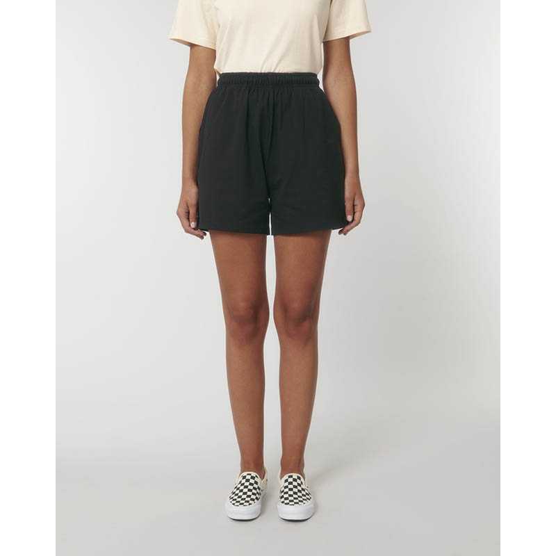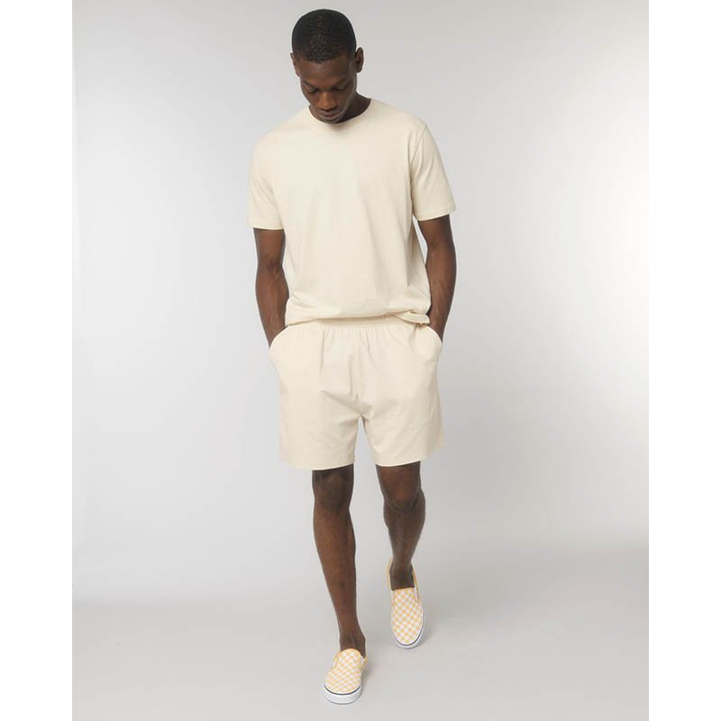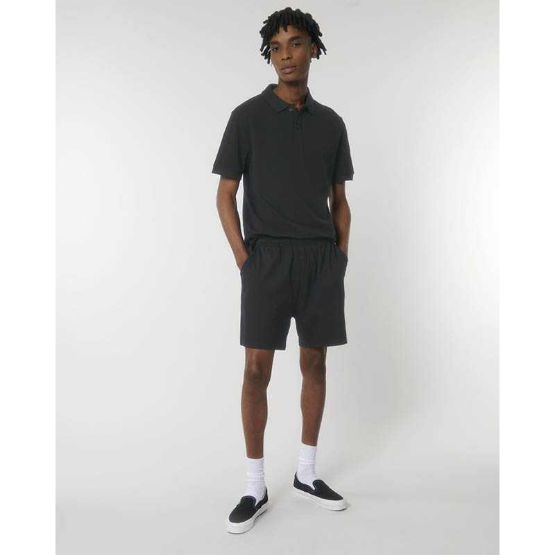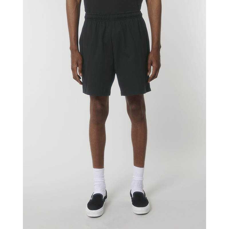 Kruhově dopřádaná bavlna. Elastický pas se šňůrkou. Dvě otevřené přední kapsy. Zadní díl s kapsou na tip. Zipy SBS
