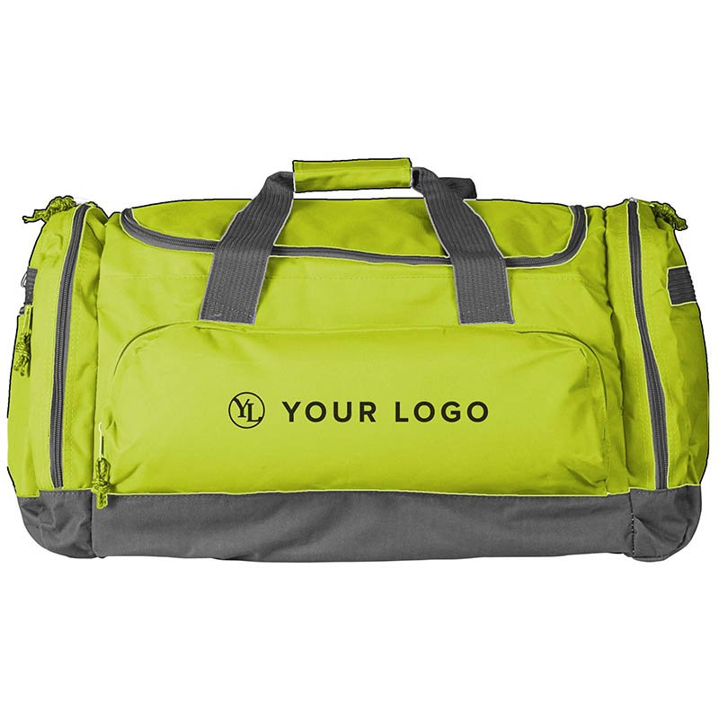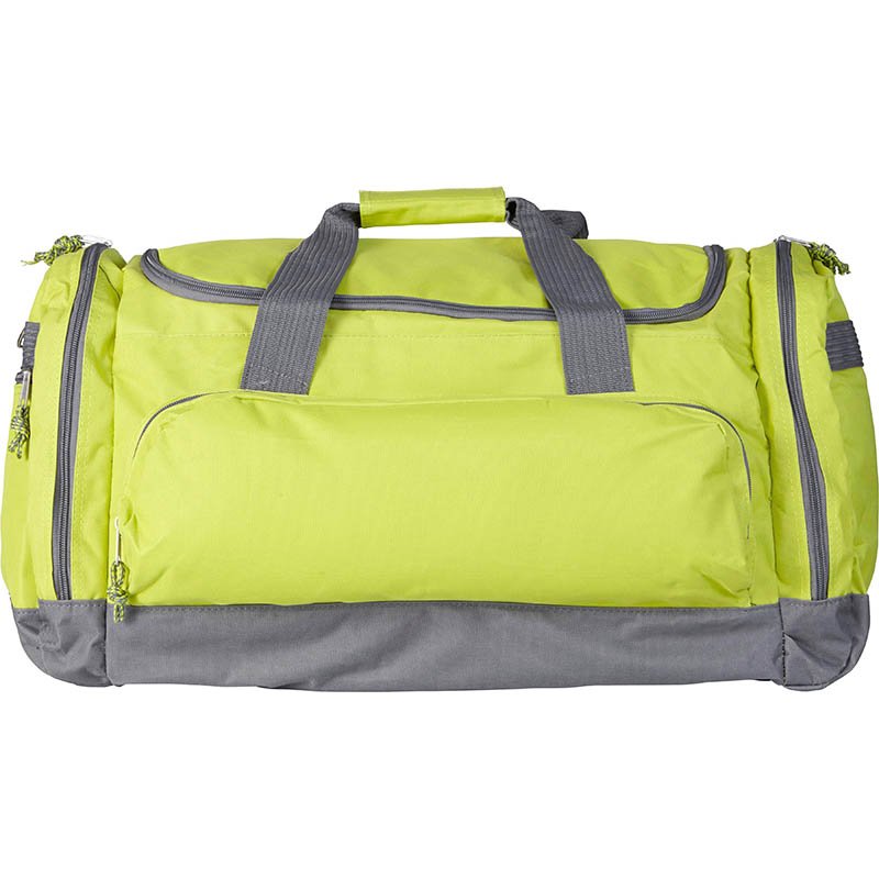 Polyester (600D) sports bag with various compartments and an adjustable shoulder strap.