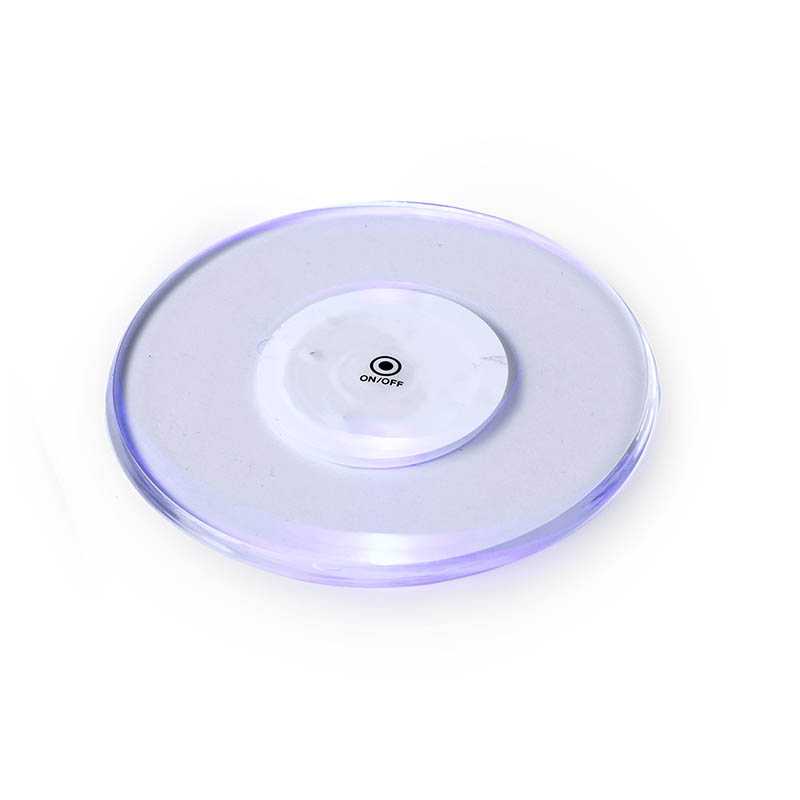 NOVINKA 2025. Original coaster with 6 LEDs for the illumination of drinks. With button on the base and 3 lighting positions (fixed light and fast or slow flashing light). It is attached to the base of any drink with self-adhesive tape and is powered by two button cells (included).
