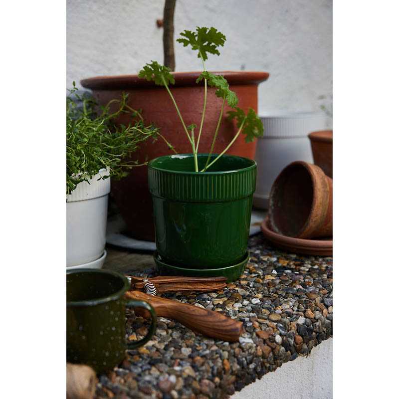 Elise pot with plate does everything right. It combines the design of colour, shape and details with practical additions like drainage holes and a plate which reaches higher up. Elise pot has a soft rounded shape with simple straight lines and is made of classic stoneware. The pot is decorated with an emblem and Sagaform’s characteristic stripes. Elise has been glazed in three beautiful close to nature colours. A pot which will be a warm addition to every home. Available in two sizes. Art.no: 5018394 Designer: Studio Sagaform Material: Stoneware Care: Dishwasher safe Colour: Green Size: o14x15cm Packaging: Box