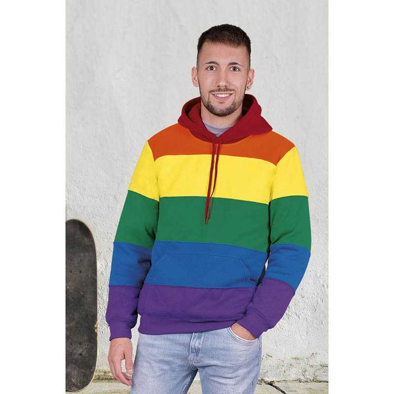 Rainbow-Coloured Hoodie with Kangaroo Pocket.Made of plush polyester fabric with a soft cotton-like touch for a comfortable feel with an inner brushed for optimal thermal insulation and extra comfort.Elasticated ribbed cuffs and waistband for comfortably fitting.Double layer hood with regulable drawstring for a better adjustment.A large central kangaroo pocket for convenient storage. Suitable marking methods: screen printing, embroidery, transfer printing, badges, shields. Ideal as promotional clothing, for a personalised gift and as casual wear.