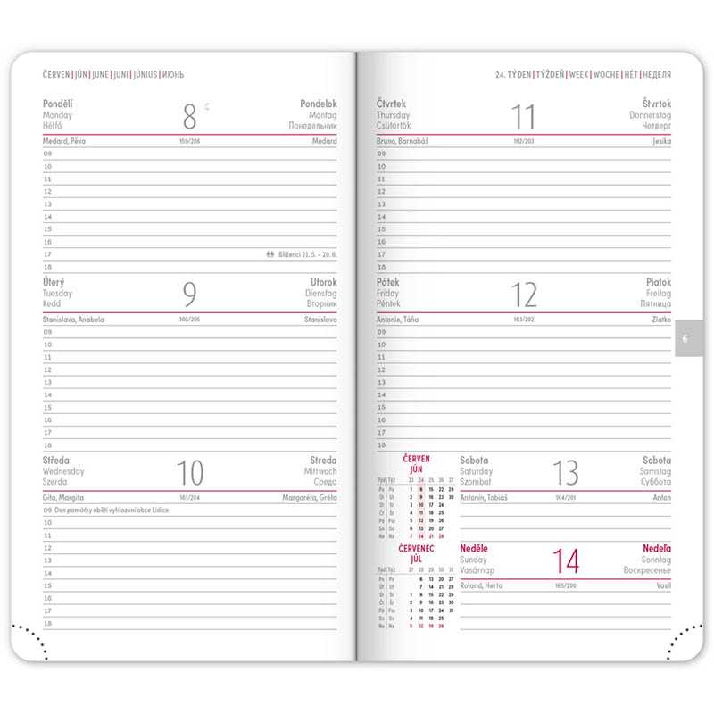 Osmnáctiměsíční diář obsahuje přehled na rok 2025 a 2026, seznam českých a slovenských jmen, česko-slovenské týdenní řádkové kalendárium se jmény a svátky a prostor na poznámky. Kalendárium začíná v červenci 2025 a končí v prosinci 2026.
