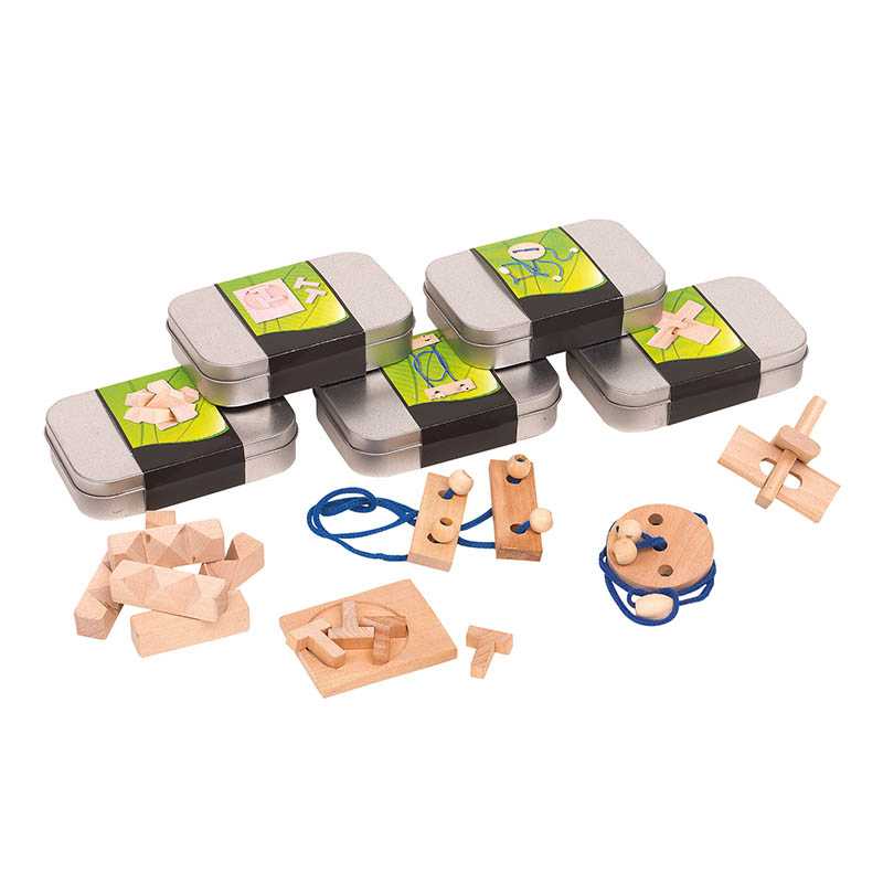 Sada 2 kovových, dřevěných a bavlněných hlavolamů: 2, resp. 4 kusy. Dodáváno v krabičce z recyklovaného papíru.