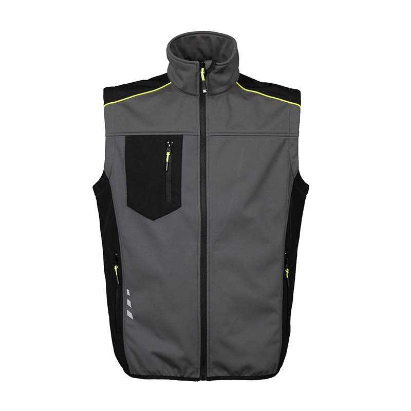 "Soft shell waistcoat waterproof and breathable - 92% Polyester - 8% elastan - Waterproof-6000 mm/H2O - Resistance to moisture g/m2/24h 4000 - Reflective thin band - Covered zippers - One chest pocket with zip and fold-away badge-pocket - Two outside pocke"