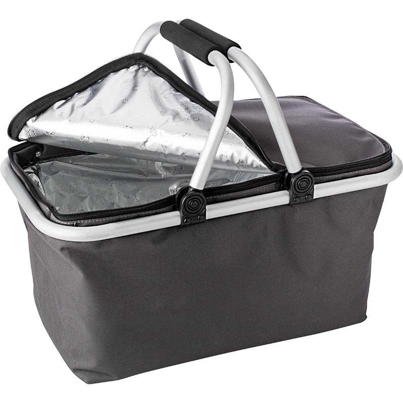 Polyester (320-330 gr/m2) collapsible, cooler shopping basket, lined with foil on the inside. Aluminium frame and handles with EVA foam grip; can be closed at the top with a zipper.