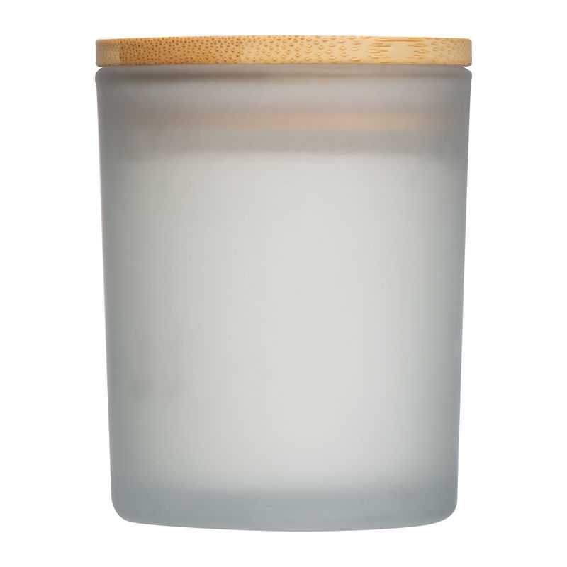 Sviečka v elegantnom matnom skle s bambusovým viečkom, dekoratívna a všestranná.