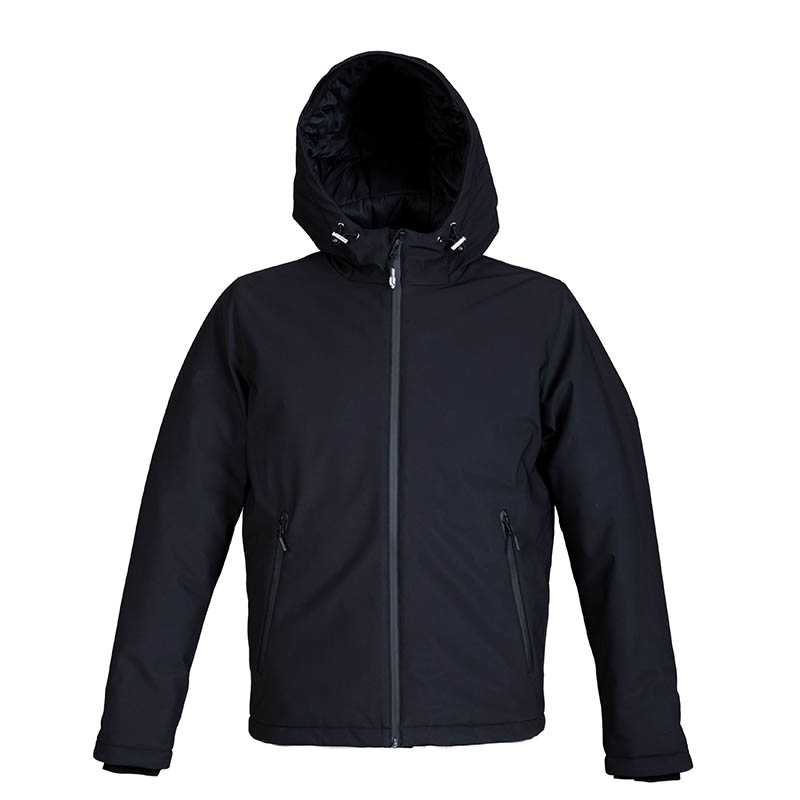 NOVINKA 2025. Jacket in composite fabric - Front and hood in polyester pongee - Water-repellent with soft polyester padding (feather effect) - Sleeves and back in 3-layer softshell fabric - Waterproof 3000 mm/H2O, - Breathability 1000 g/m2/24h - Anti-pilling microfleece lining - Inner fabric under the collar that can be lifted for customization - Waterproof laser-cut zips - Central zip with internal windproof fabric - Chin protection fabric - Padded detachable hood with flap and drawstring adjustment - Two large external pockets with zip - One internal wallet pocket with zip - Windproof stretch fabric inside the cuffs