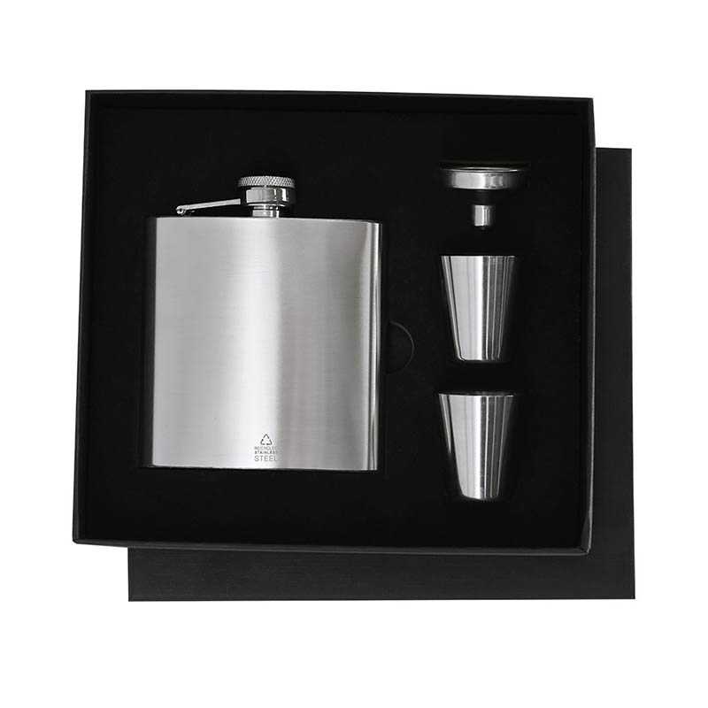 NOVINKA 2025. Flask set with accessories in Recycled Stainless Steel. Includes:- 175 ml flask with drip-free system and screw closure for safe storage without spills.- Two measuring cups of 30 ml capacity.- Dosage funnel, which facilitates filling.Includes Recycled Stainless Steel label. Presented in a black box.Steel is one of the most demanded materials and can be found almost everywhere, from daily-use products to large constructions. With countless properties, among which durability and high level of reusability stand out, making it a highly valued alternative in sustainability solutions. Properly treated, it allows obtaining new resources of infinite use.
