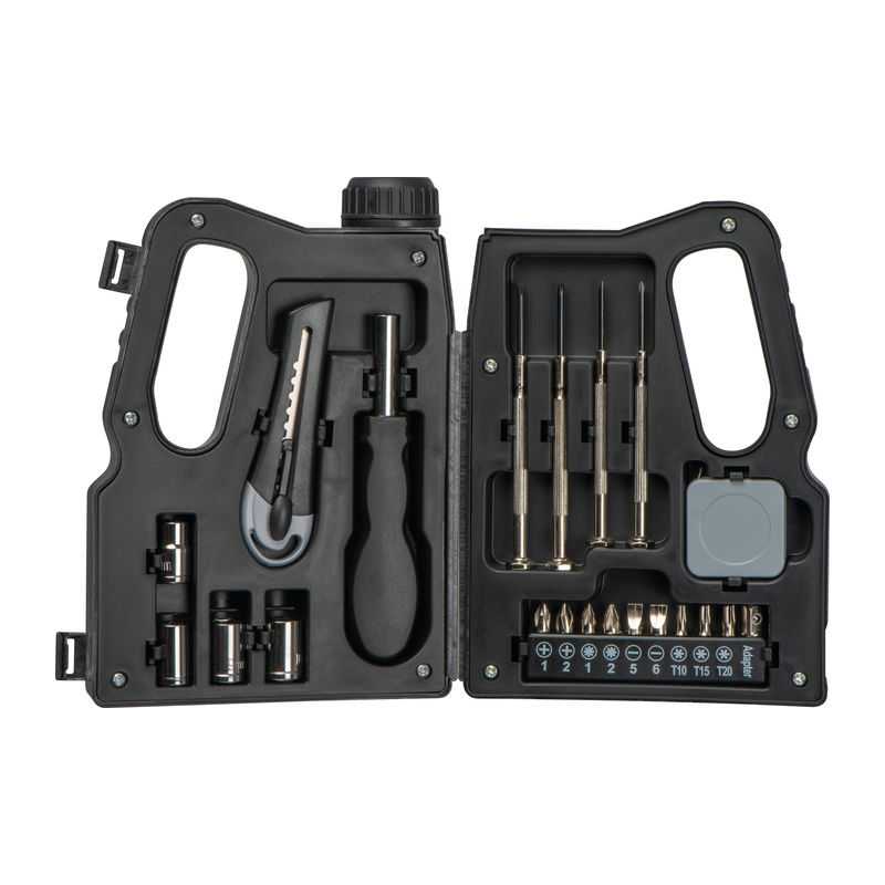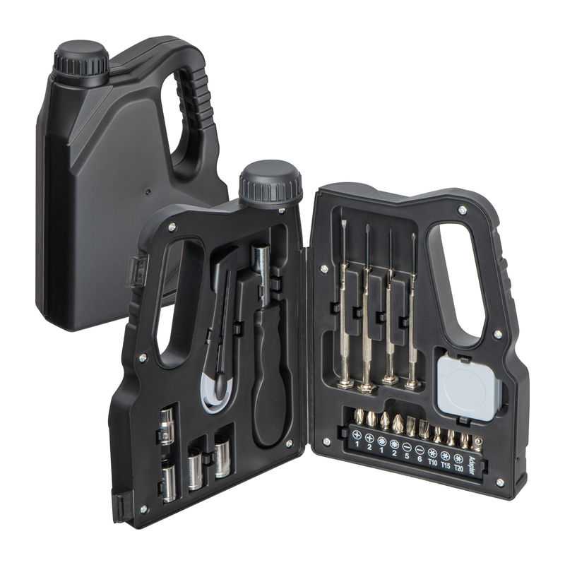 Klasická sada nástrojov v puzdre v tvare kanistera. Praktická a kompaktná, ideálna na cesty a drobné opravy. Robustný dizajn a jednoduché skladovanie.