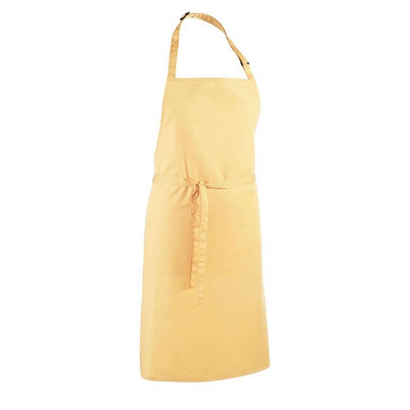 Tkanina.65 % polyester, 35 % bavlněný kepr.Denim: 265 gsm.Snadná péče.Vlastnosti.Látkový pásek kolem krku.90cm zavazovací látkové pásky.Posuvná nastavovací spona.Stylově sladěno se zástěrou střední délky PR151 „Colours Collection“.