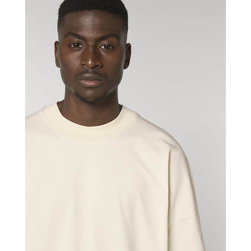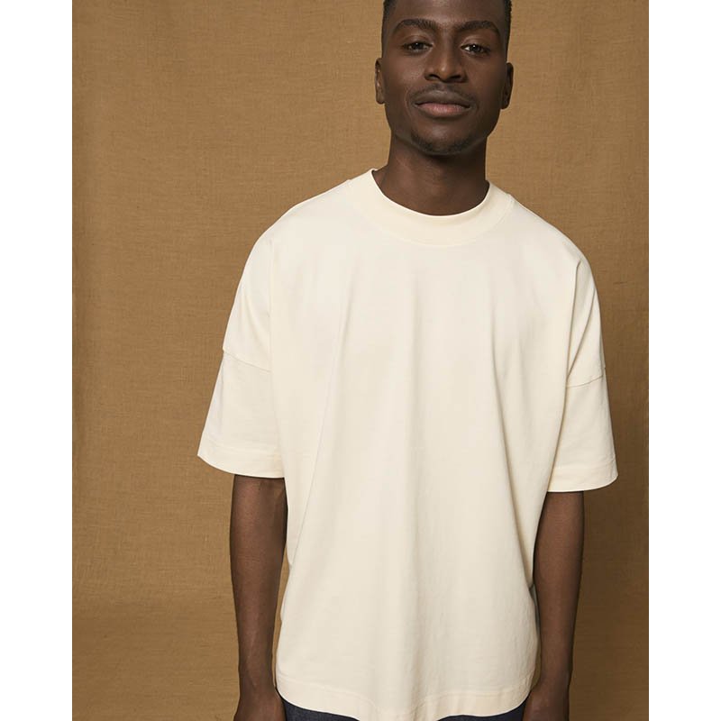Set-in sleeve Dropped shoulder Wide 1x1 rib neck collar with single topstitch Inside back neck tape in self fabric Sleeve hem and bottom hem with wide double topstitch