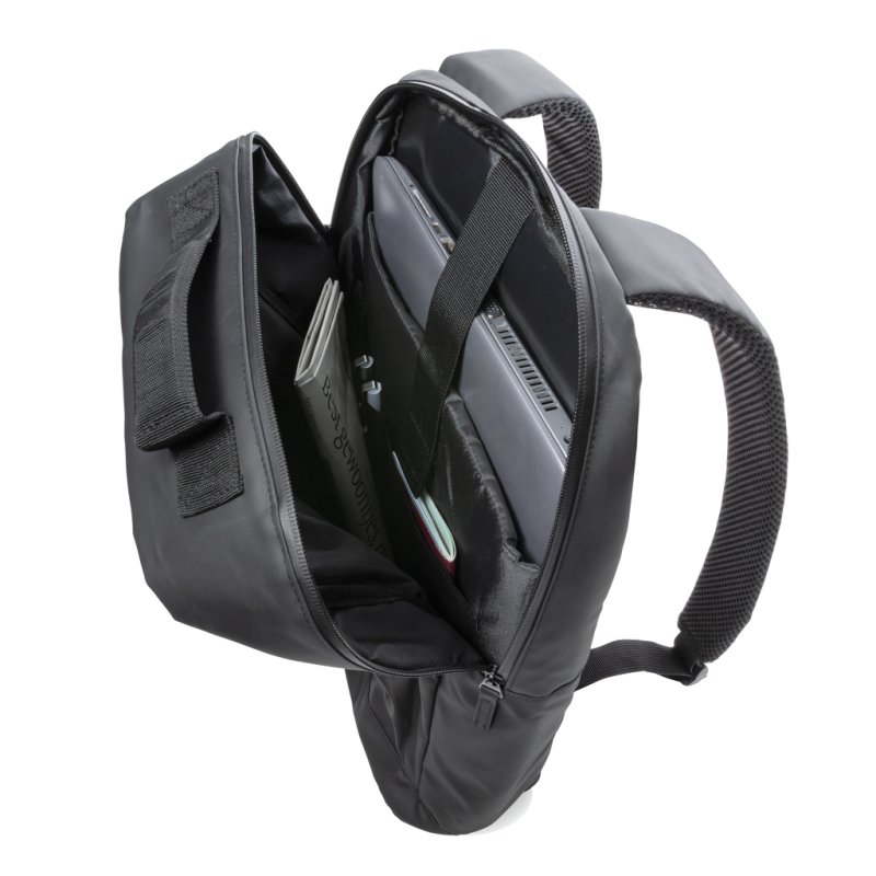 Batoh na notebook z 900D tarpaulínu s vysokou hustotou. Tento batoh má systém ochrany proti krádeži: hlavní přihrádka se skrytým zipem a zadní část se 2 skrytými kapsami na zip pro větší bezpečnost. Hlavní přihrádka má podšívku a je polstrovaná, se 2 polstrovanými dělicími přihrádkami pro notebook do velikosti až 15.6" a tablety až 10.5". Batoh má několik vnitřních kapes, včetně polstrované kapsy na smartphone a s výstupem pro sluchátka. Uvnitř má kabelové spony. Na boku má batoh vnější kapsu na zip, s přístupem do vnitřní kapsy, ideální pro přenosnou baterii, což usnadňuje přenášení více zařízení. Zadní část je polstrovaná a má polstrovaný systém opěrky zad, díky kterému je batoh ergonomický a pohodlný. Polstrované ramenní popruhy mají 1 kapsu na zip. Příslušenství není součástí. Kapacita je až 25 l. 320 x 440 x 200 mm