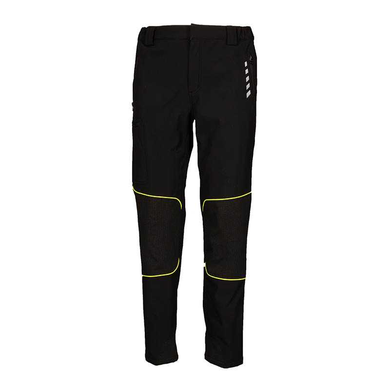 Waterproof 3-layer soft shell pants - 95% polyester - 5% elastane - Waterproof 8000 mm/H2O - Breathability 1000 g/M2/24h - Anti-pilling fleece interior - 92% polyester - 8% elastane reinforcement fabric abrasion resistant on knees and backside - Taped zip - Two zip pockets - A side pocket with zip - A back pocket with zip - Fluo yellow stitching on the knees - Elastic waist and oversized loops - Covered snap button at the waist - No labe