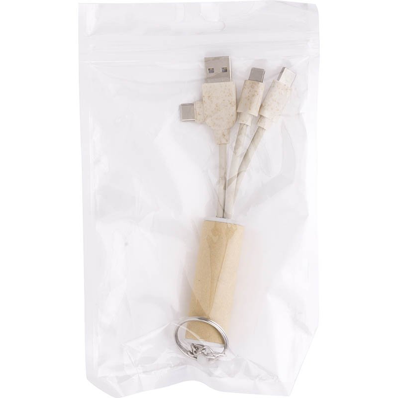 ABS extendable charging cable with bamboo details. With USB-C, lightning, and USB-A. Individually packaged in a brown cardboard pouch.