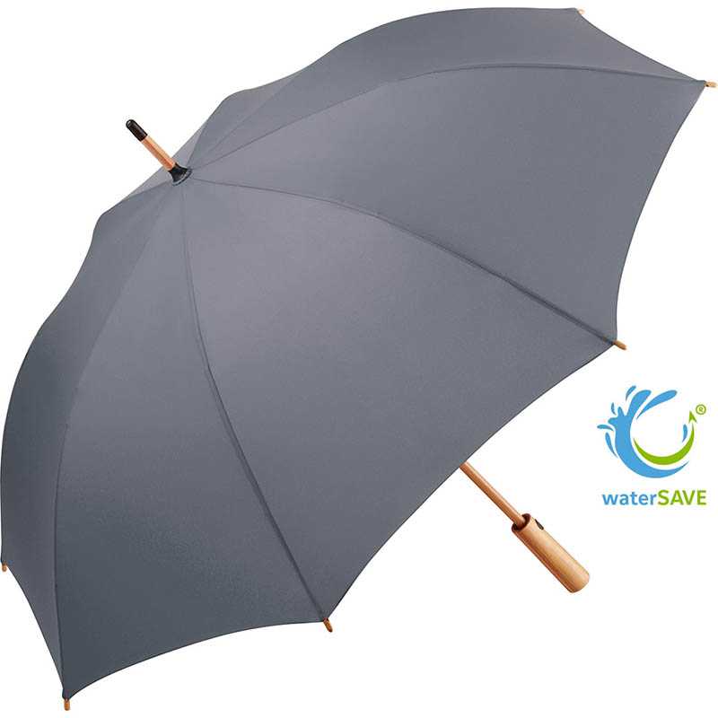 Convenient automatic function for quick opening, high-quality Windproof PLUS system for maximum frame flexibility in stormy conditions, flexible fibreglass ribs, lightweight bamboo shaft, polyester ponge cover material made of recycled plastics, with waterSAVE® label on the closing strap (with new deliveries), bamboo tips, straight bamboo handle with black push-button and promotional labelling option. Also available as mini umbrella (art. 5429).